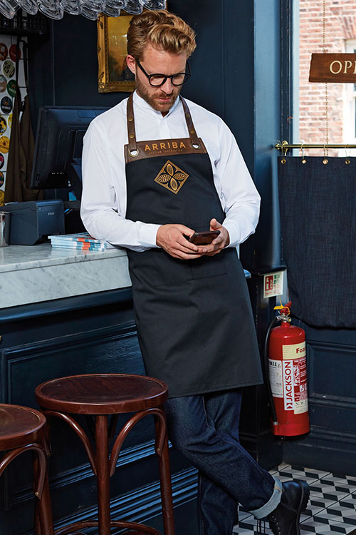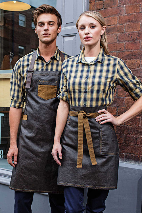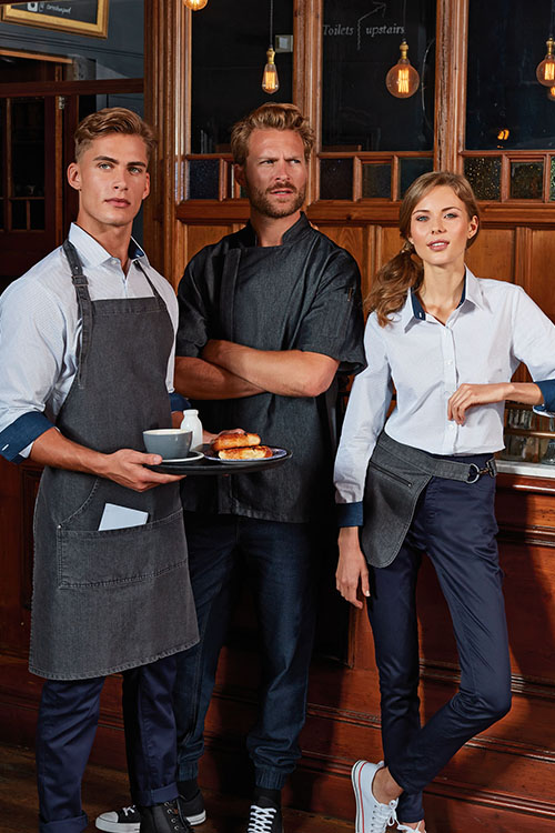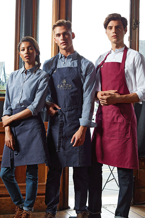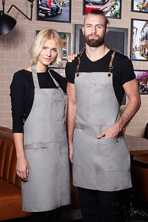 Diese und die Modelle Herrenlatzschürze und Langschürze können mit einer Bluse oder einem Hemd kombiniert nicht nur in der Gastronomie, sondern auch als Servicebekleidung in Reformhäusern, Bio-Läden, Kosmetik-Läden oder Bäckereien getragen werden. Auch in der eleganten Variante, in der Zusammensetzung Polyester und Baumwolle, sind diese Schürzen in Bistros und Cafés ein toller Blickfang.