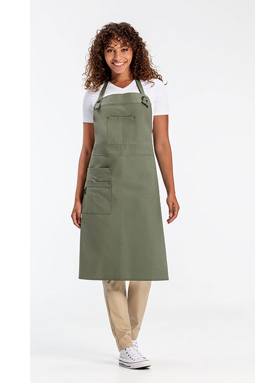 Etwas legerer und doch hochwertig sind die zweifarbigen Latzschürzen. Die Damenmodelle haben eine asymmetrische Dekolleté-Form, die Herren tragen zusätzlich eine Krawatte. Die Farben Apfelgrün, Orange und Gelb mit den Grundfarben Blau, Schwarz und Braun sind trendy und wirken farblich dynamisch. Auch die einfarbigen Latzschürzen mit farbiger Naht und der asymmetrischen Brusttasche sind mit hochwertigen Stoffen hergestellt und modisch im Trend.